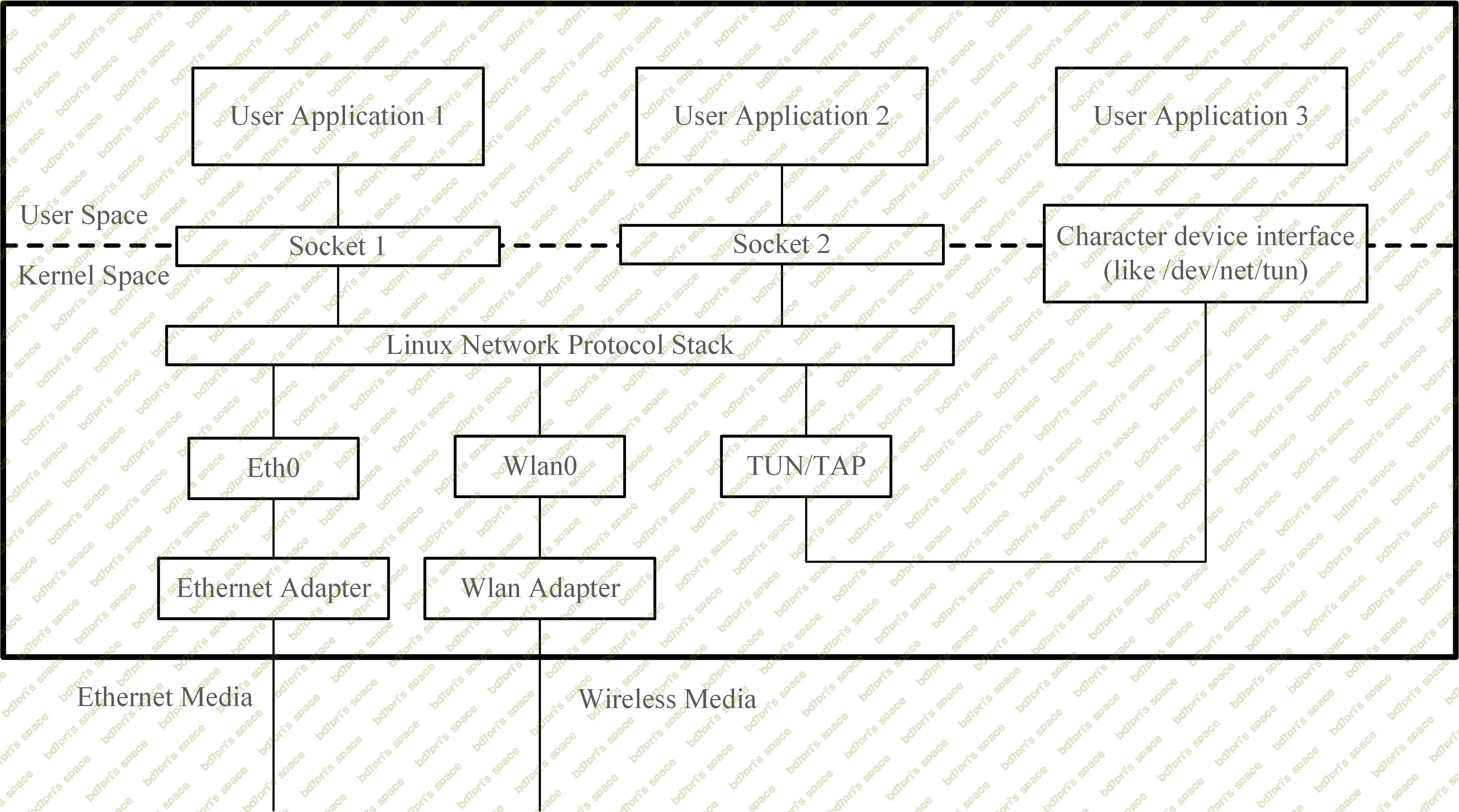 从图中我们可以直观地看到:用户程序通过Socket接口操作物理网卡和虚拟网卡的方法没有任何不同,区别在于物理网卡和虚拟网卡对于收发数据包的处理方式。物理网卡将Socket用户的数据包发到物理链路上,并从物理链路上接收数据包返回给Socket用户;而虚拟网卡将Socket用户的数据包发到本地的一个字符设备中,并从该字符设备中读取的数据返回给Socket用户。换句话说,虚拟网卡把Socket用户的网络数据包“重定向”到了一个字符设备中!这使得操作这个字符设备的其他程序可以通过文件接口接收Socket用户发来的包,或向Socket用户发包。