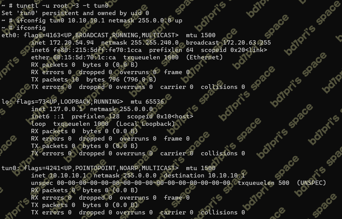 ifconfig命令设置tun0网卡的IP地址,并启用这个网卡:ifconfig tun0 10.10.10.1 netmask 255.0.0.0 up