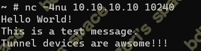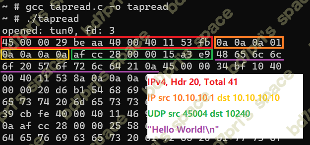 作为验证,笔者创建了一个虚拟网卡tun0,并设置其IP地址为10.10.10.1/8,然后利用nc工具向该网卡发送目标为10.10.10.10:10240的UDP数据报。同时,笔者利用一个C程序读取tun0虚拟网卡对应的字符设备接口,并逐字节观察读出的数据报,发现可以收到正常的UDP/IP数据报文。具体过程如下: