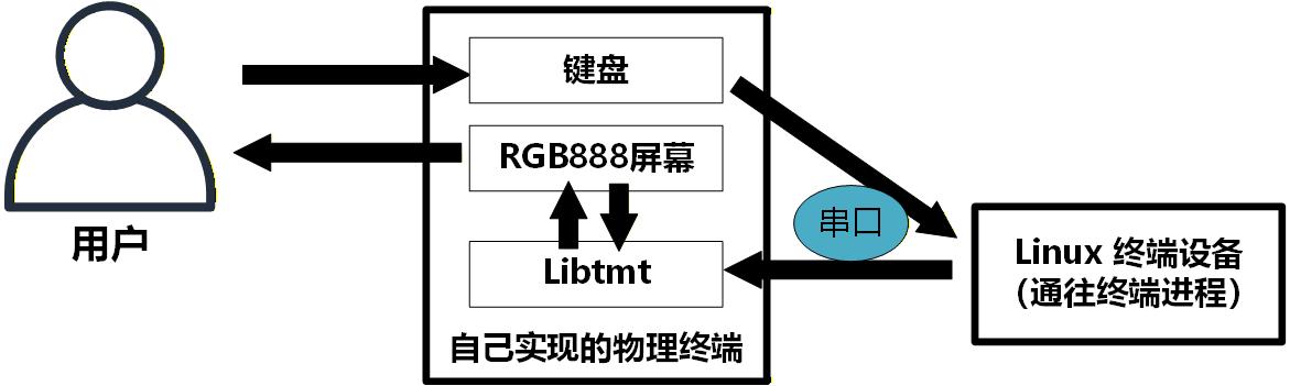 上面已经提到,终端的类型有很多种。笔者想实现的终端是物理终端。通过两根串口线,笔者的物理终端和 Linux 主机进行通信。而 libtmt 通过读取串口更新终端内部状态,而一个RGB888 屏幕实时地读取 libtmt 的状态,将终端展示给用户。